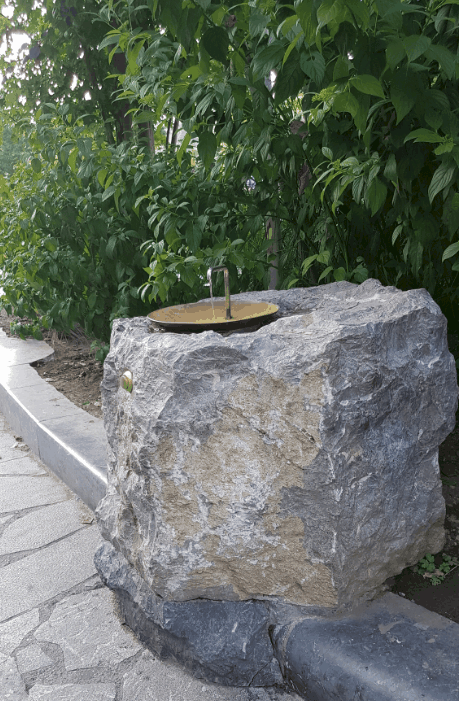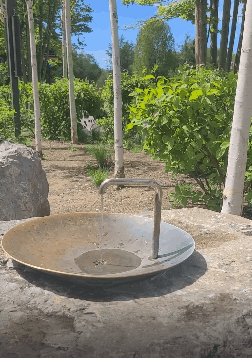 Ces trois fontaines s'intégrent parfaitement dans un espace arboré et feuillu. L'harmonie de l'eau est de la nature s'exprime avec douceur et fluidité.