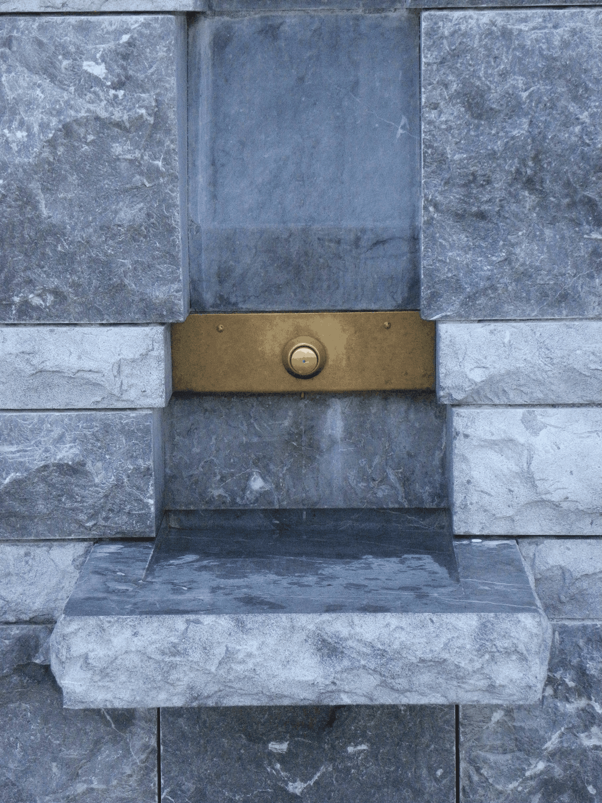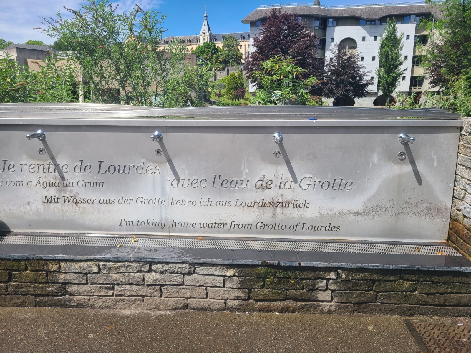 Ces 18 nouveaux robinets poussoir où coule l'eau de source de la grotte reposent sur un mur arrondi, convexe, bâti en pierre marbrière d'Arudy, chef-lieu de canton de la vallée d'Ossau. Cette pierre locale des Pyrénées Atlantique, de couleur grise, très dense, perpétue l'histoire des bâtisseurs des sanctuaires de Lourdes.